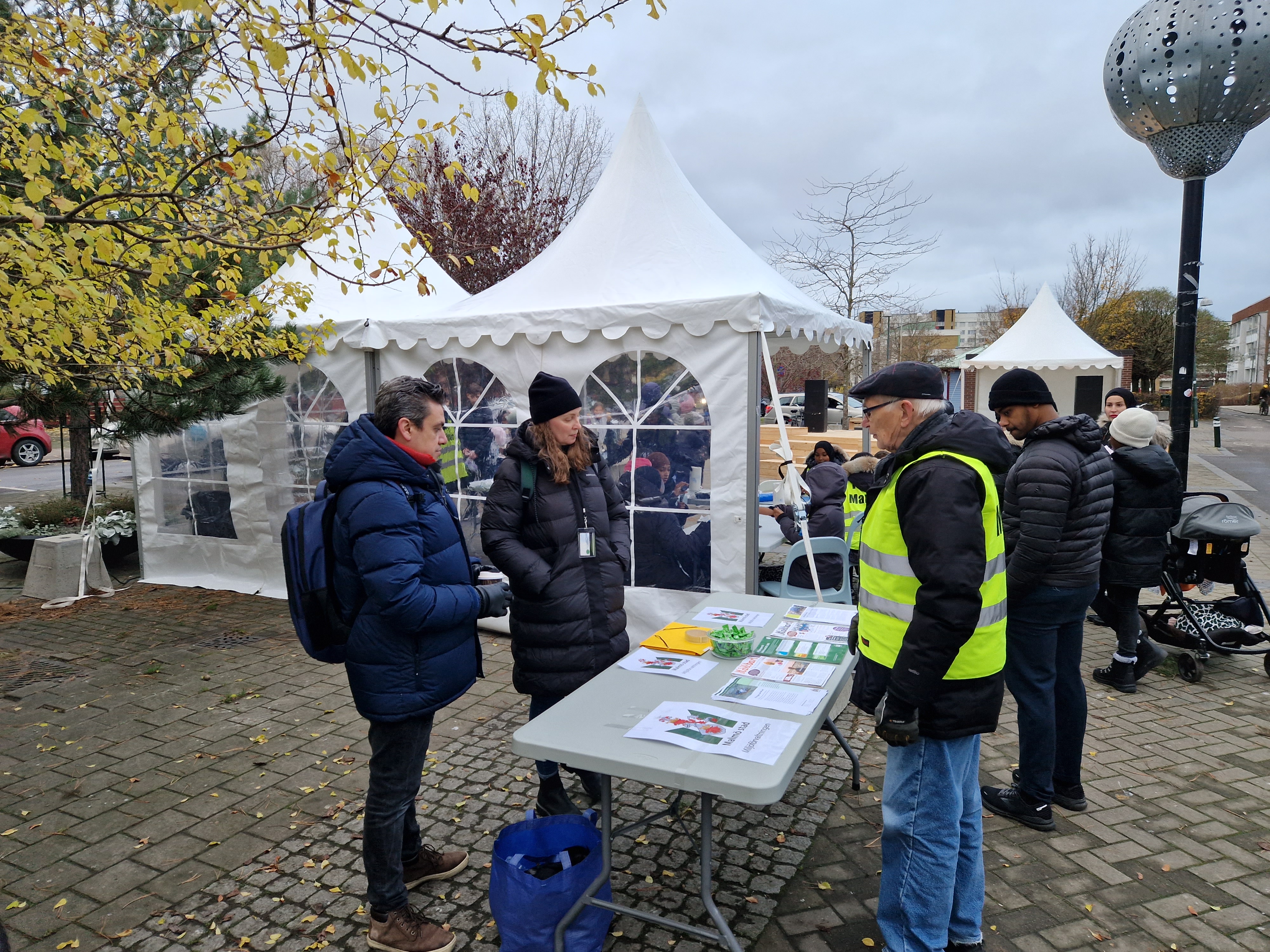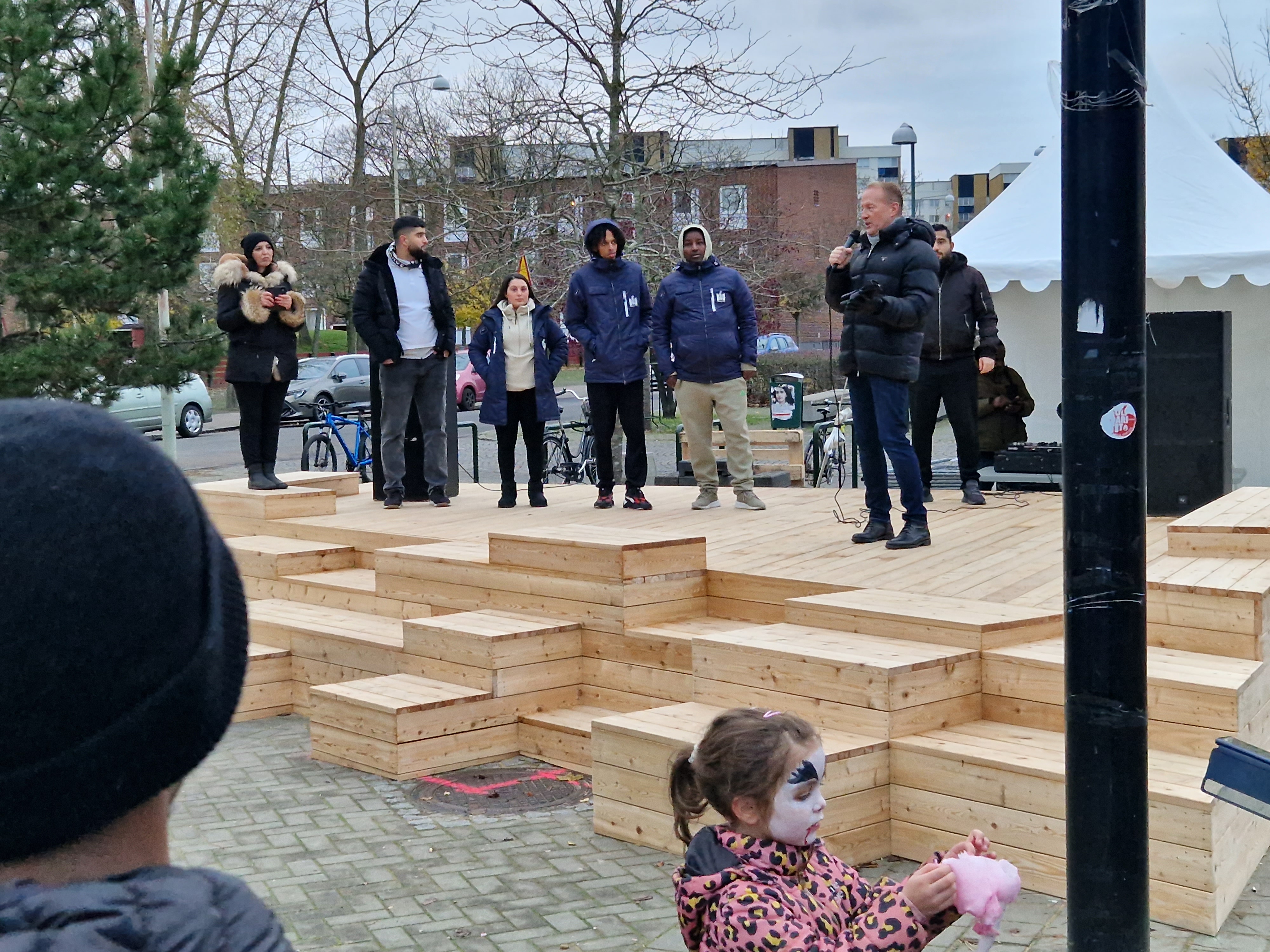 En del av ”Samverkansatsning Rosengård” som Trygg Malmö är en del av var att bygga en scen som kan användas vid olika evenemang på Örtagårdstorget. Fredagen den 2:a december hade vi en invigning av scenen i kombination med en hållbargetsdag på torget. På plats fanns bland andra Andrew Roberts som är avdelningschef för offentlig miljö på Fastighets- och gatukontoret och Ibrahim Taha från Rädda Barnen som var konferencier.